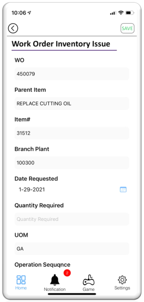 Solution: Since the above process involves a manual entry of quantity in the work order print report this business process can be automated. Instead of printing the work order component report this information can be interfaced and viewed through mobile application. The quantity can be entered in the mobile app/tablet and plug into the JDE system at the time of backflush to update the inventory.